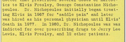 ##EMBED## Dr. Nick on the Simpsons is named after the doctor that prescribed narcotics to Elvis Presley, George Constantine Nichopoulos. Dr. Nichopoulos initially began treating Elvis in 1967 for “saddle pain” and later was hired as his personal physician until Elvis’ death in 1977. In 1980, Dr. Nichopoulos was was indicted for over prescribing drugs to Jerry Lee Lewis, Elvis … Continue reading Dr. Nick on the Simpsons was Named After the Doctor that Prescribed Narcotics to Elvis Presley