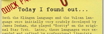 ##EMBED## Both the Klingon language and the Vulcan language were initially very crudely developed by James Doohan, who played “Scotty” on the original Star Trek. Later, these languages were expanded and refined by professional linguists, primarily by Marc Okrand. Click Here for Sources and More Interesting James Doohan Facts