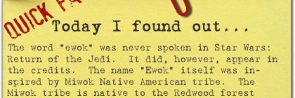 ##EMBED## The word “ewok” was never spoken in Star Wars: Return of the Jedi. It did, however, appear in the credits. The name “Ewok” itself was inspired by Miwok Native American tribe. The Miwok tribe is native to the Redwood forest where most of the Endor scenes were filmed. Source