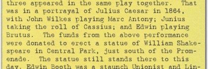 ##EMBED## The three brothers John Wilkes, Junius Brutus (Jr.), and Edwin Booth, all critically acclaimed actors of their day, only once all three appeared in the same play together. That was in a portrayal of Julius Caesar in 1864, with John Wilkes playing Marc Antony; Junius taking the roll of Cassius; and Edwin playing Brutus. The funds from the above … Continue reading The Statue of William Shakespeare in Central Park was Paid for from Funds Donated from a John Wilkes Booth Performance of Julius Caesar