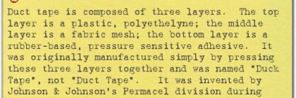 ##EMBED## Duct tape is composed of three layers. The top layer is a plastic, polyethelyne; the middle layer is a fabric mesh; the bottom layer is a rubber-based, pressure sensitive adhesive. It was originally manufactured simply by pressing these three layers together and was named “Duck Tape”, not “Duct Tape”. It was invented by Johnson & Johnson’s Permacel division during … Continue reading What Duct Tape is Made Of