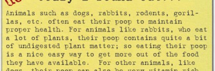 ##EMBED## Animals such as dogs, rabbits, rodents, gorillas, etc. often eat their poop to maintain proper health. For animals like rabbits, who eat a lot of plants, their poop contains quite a bit of undigested plant matter; so eating their poop is a nice easy way to get more out of the food they have available. For other animals, like … Continue reading Why Animals Sometimes Eat Their Poop