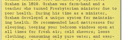##EMBED## Graham crackers were invented by Sylvester Graham in 1829. Graham was farm-hand and a teacher who turned Presbyterian minister due to poor health. During his time as a minister, Graham developed a unique system for maintaining health. He recommended hard mattresses for sleeping; keeping your bedroom windows open at all times for fresh air; cold showers; loose clothing; consuming … Continue reading Graham Crackers Were Invented by a Presbyterian Minister Obsessed with His Health