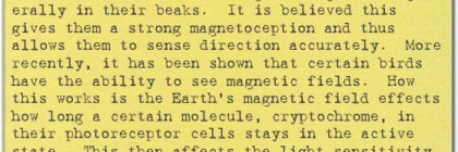 ##EMBED## Many avian life forms posses a region of their bodies that contain a biological magnetite, generally in their beaks. It is believed this gives them a strong magnetoception and thus allows them to sense direction accurately. More recently, it has been shown that certain birds have the ability to see magnetic fields. How this works is the Earth’s magnetic … Continue reading How Birds Navigate
